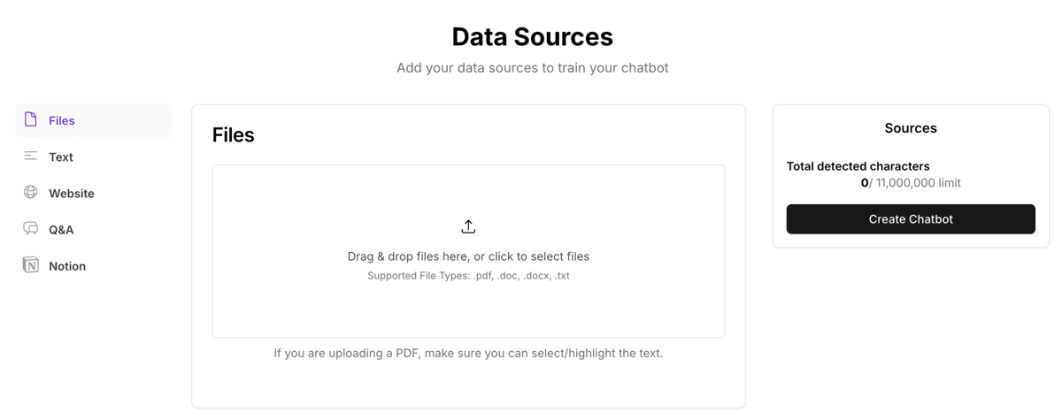 The first thing that Chatbase tells you to do is to upload your files. So if you've prepared them, let's do that, and then click "Create Chatbot" (on the free plan, you can create 1 chatbot with maximum of 400k characters, and you can embed into your site).