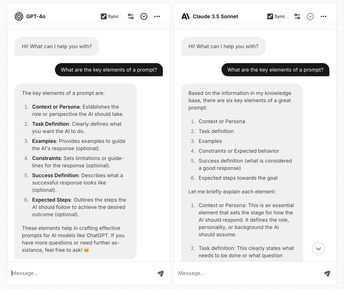 See my screenshot on "What are the key elements of a prompt" question response. I just like Claude over GPT right now, personal preference. They both told roughly the same things from my files.